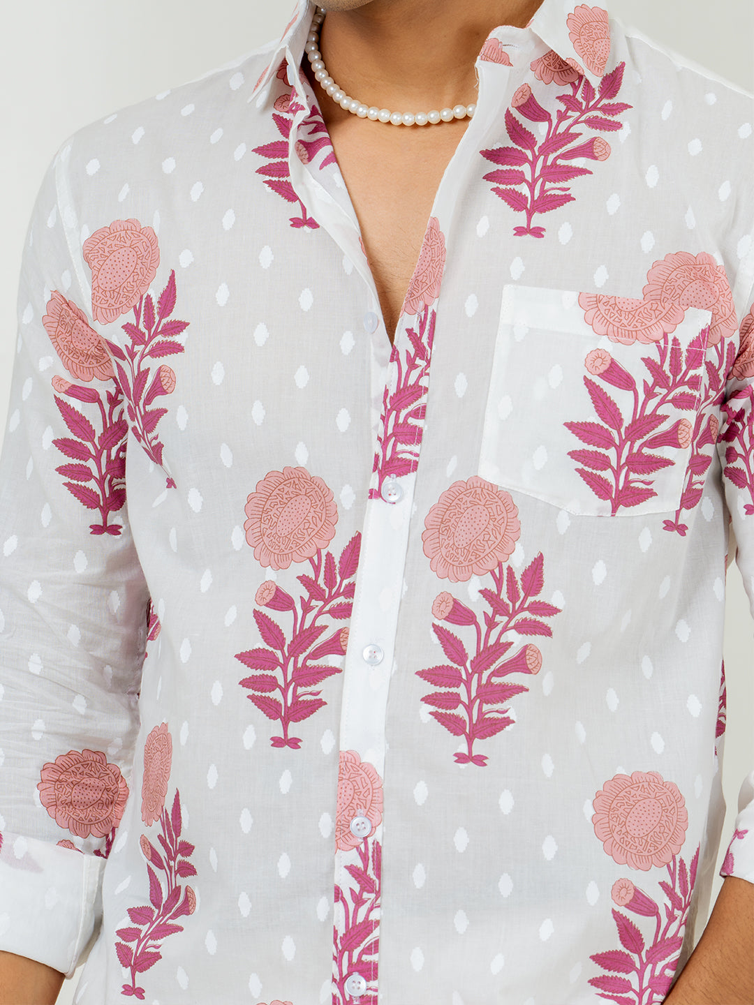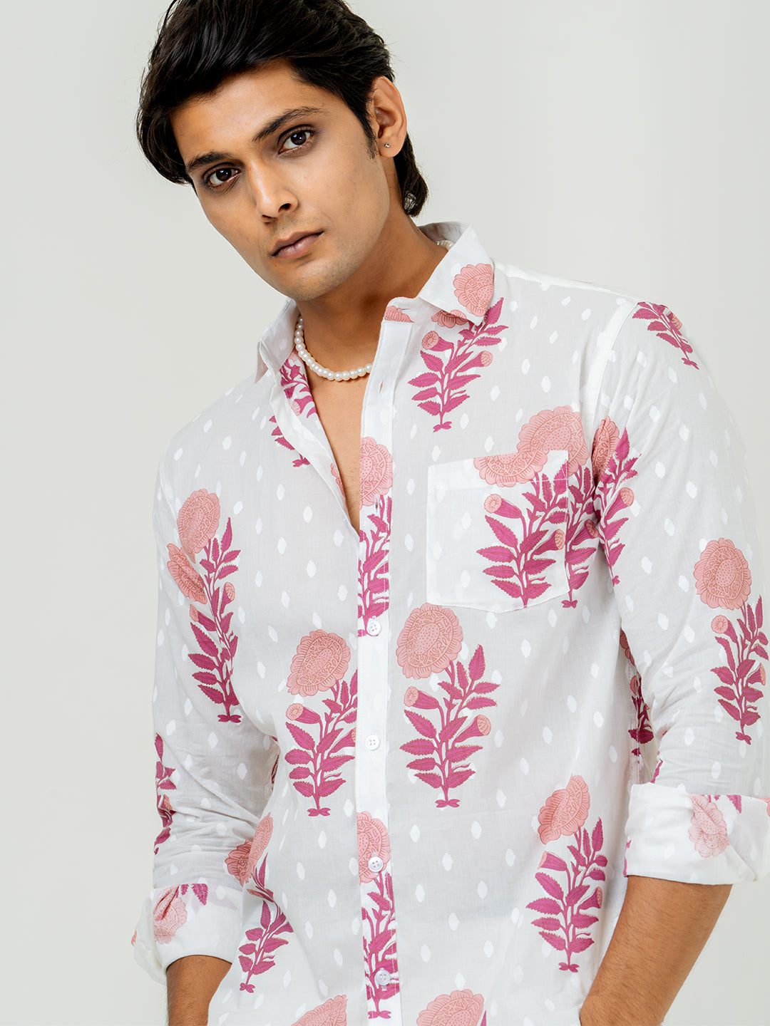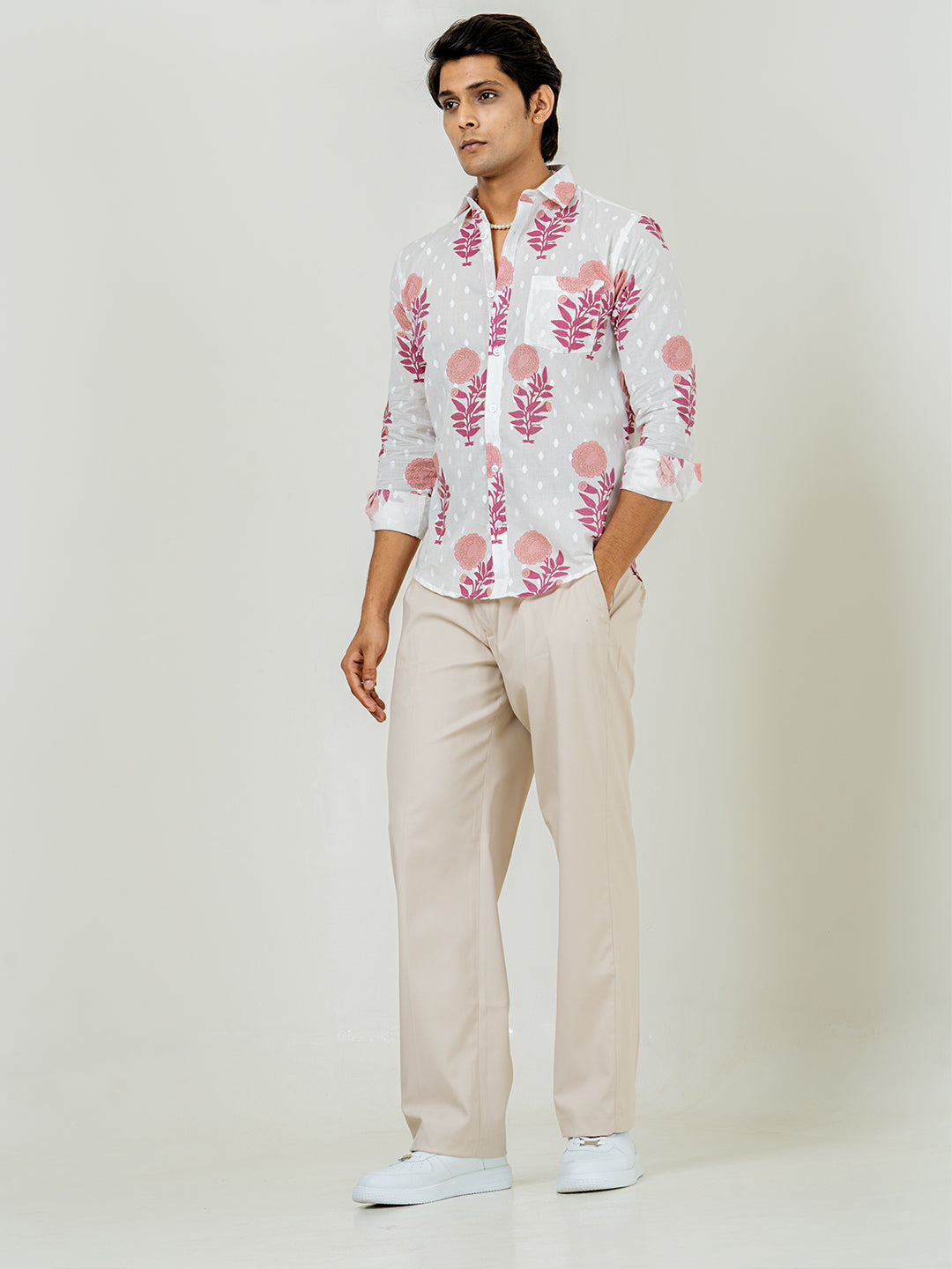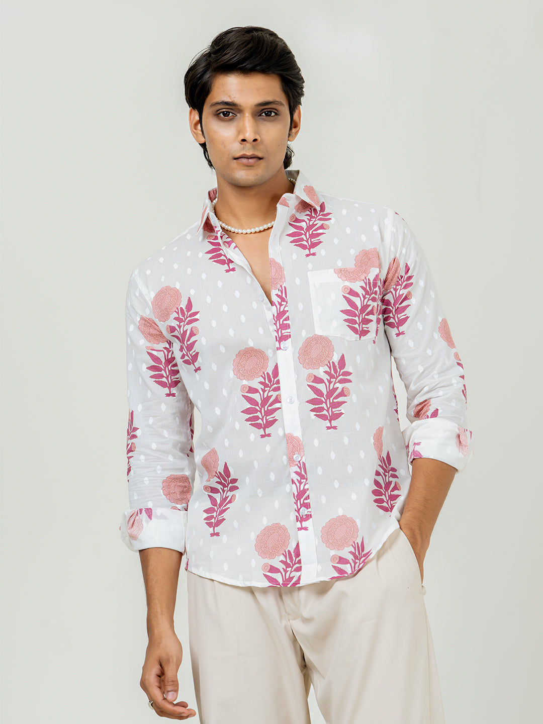 This white floral shirt with leaf prints adds a touch of nature to your wardrobe. The cotton fabric is soft and breathable, perfect for staying stylish and comfortable all day.