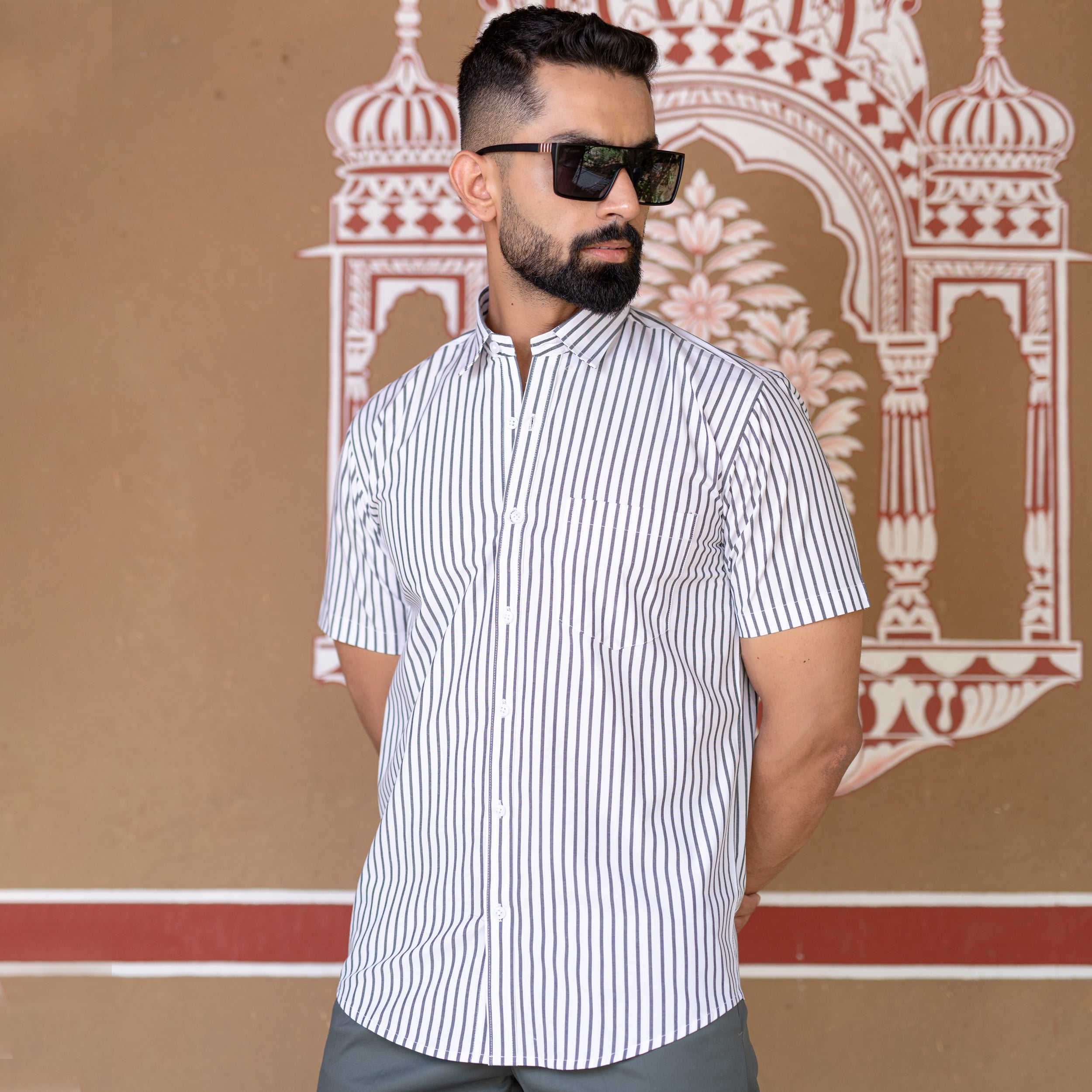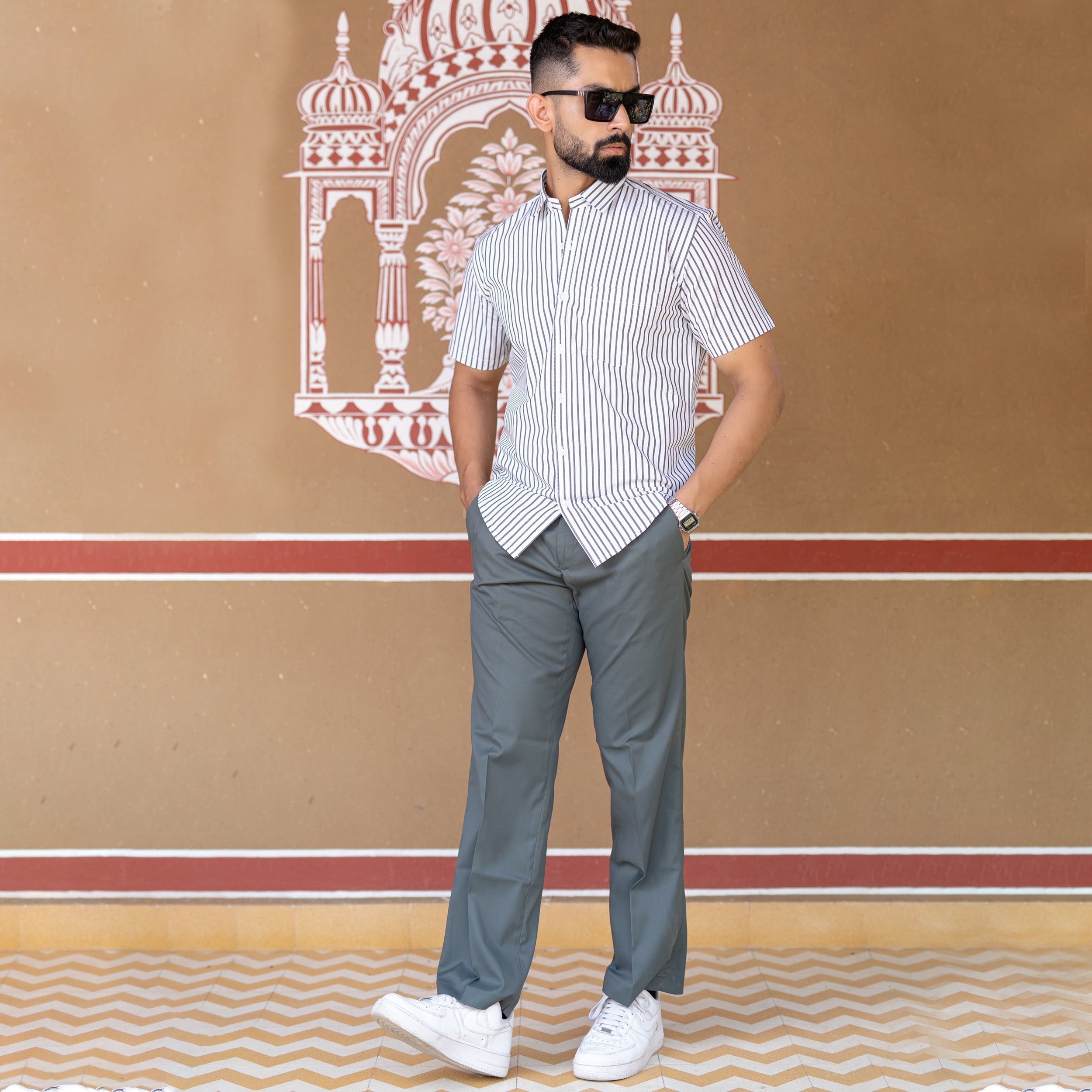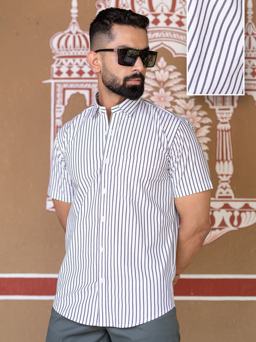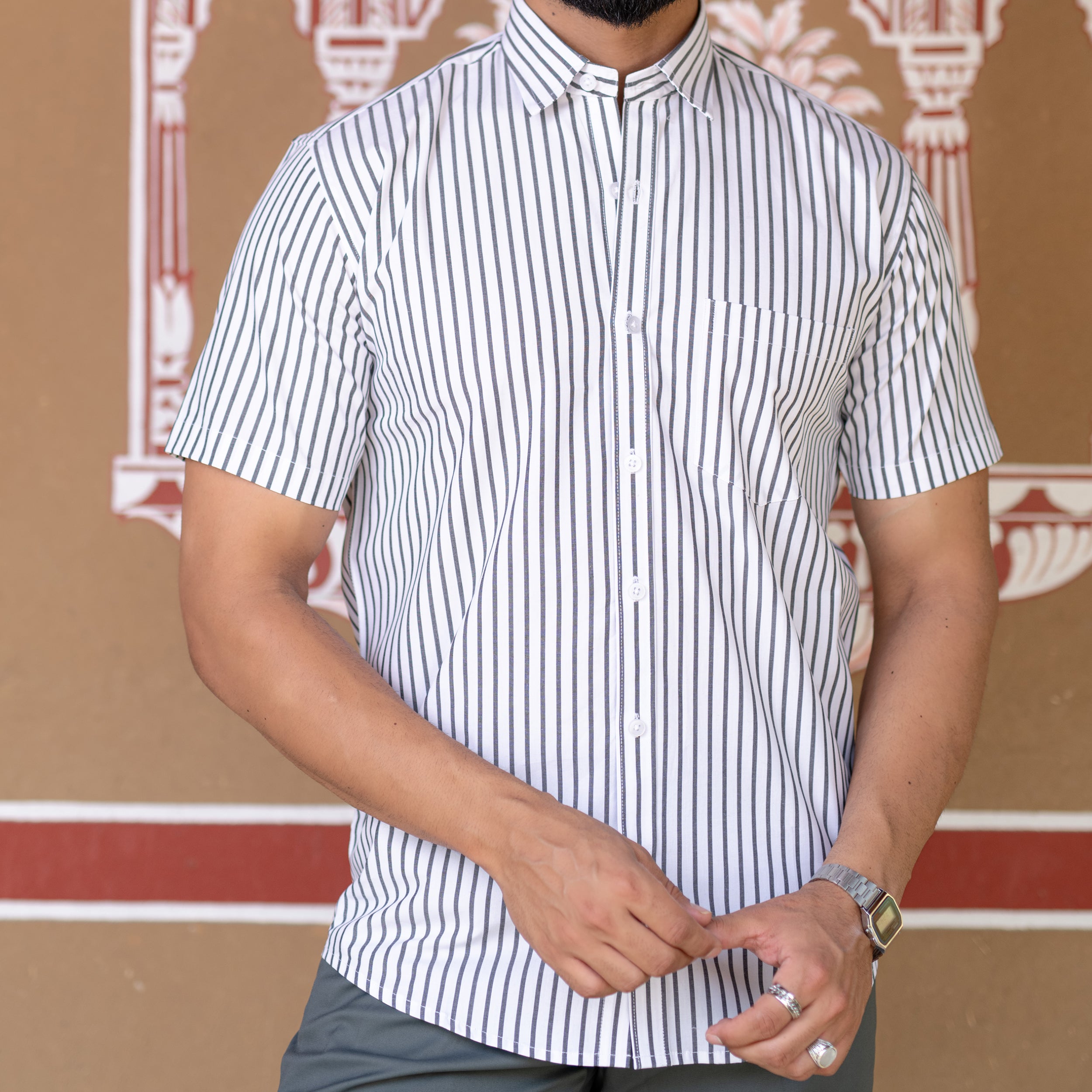 About Product- Sleek and professional, this shirt blends subtle grey stripes with classic white for a sharp look.
