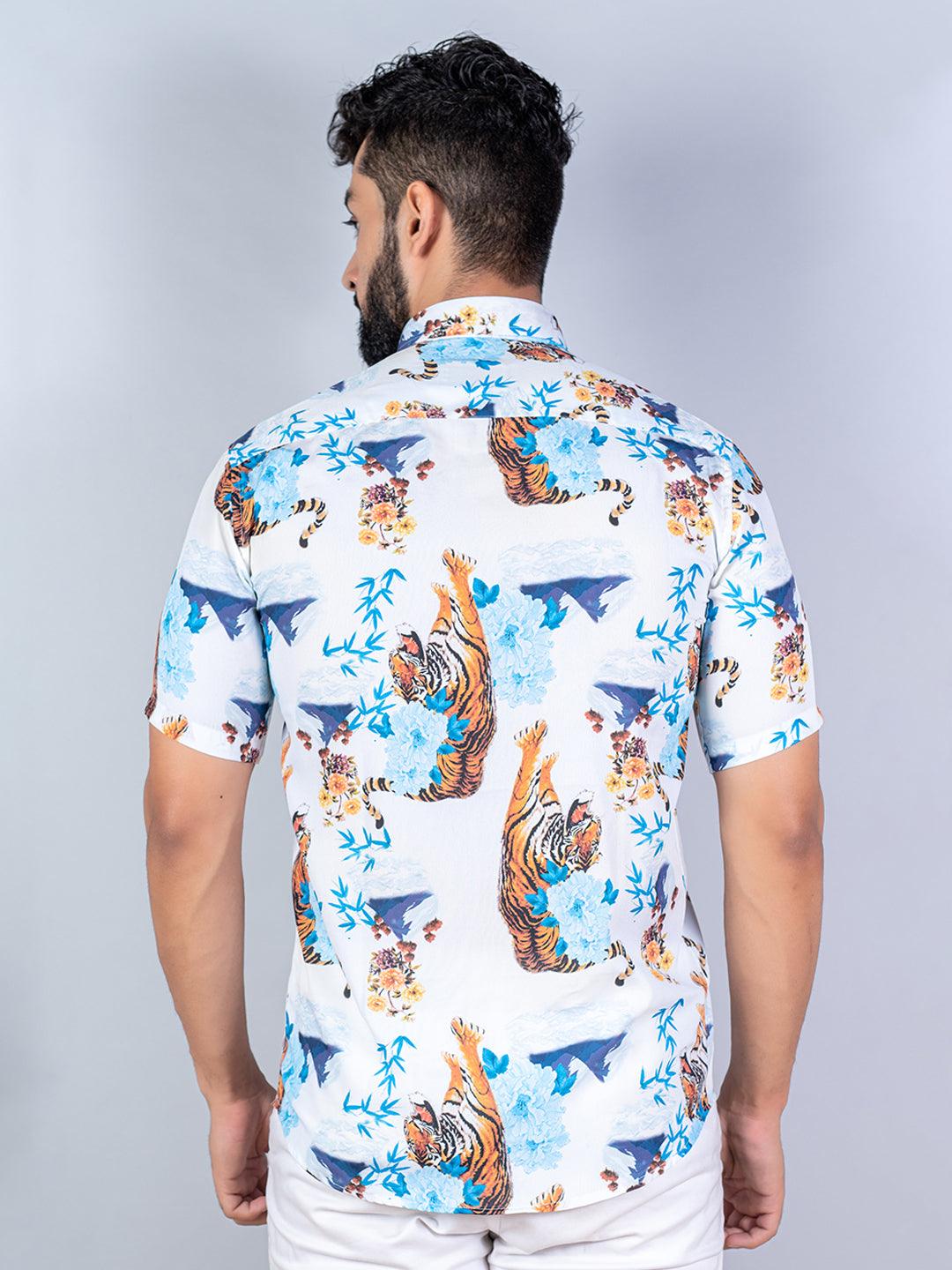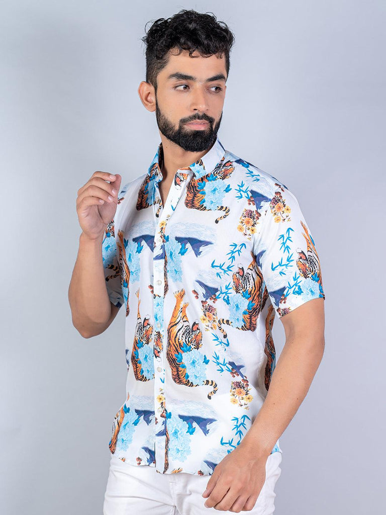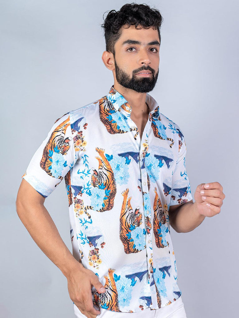 About the product: This white tiger printed half sleeves crepe shirt is made to make you look smart. This comfortable shirt is a must inside your wardrobe.