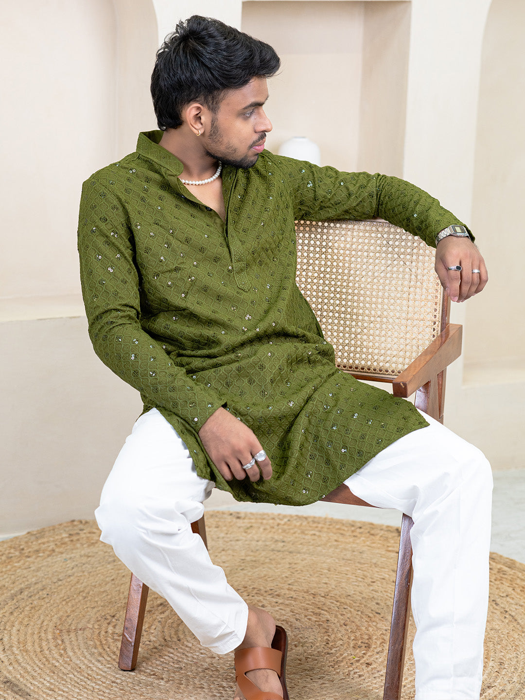 Woodbine Green Chikankari Embroidered Cotton Men's Kurta