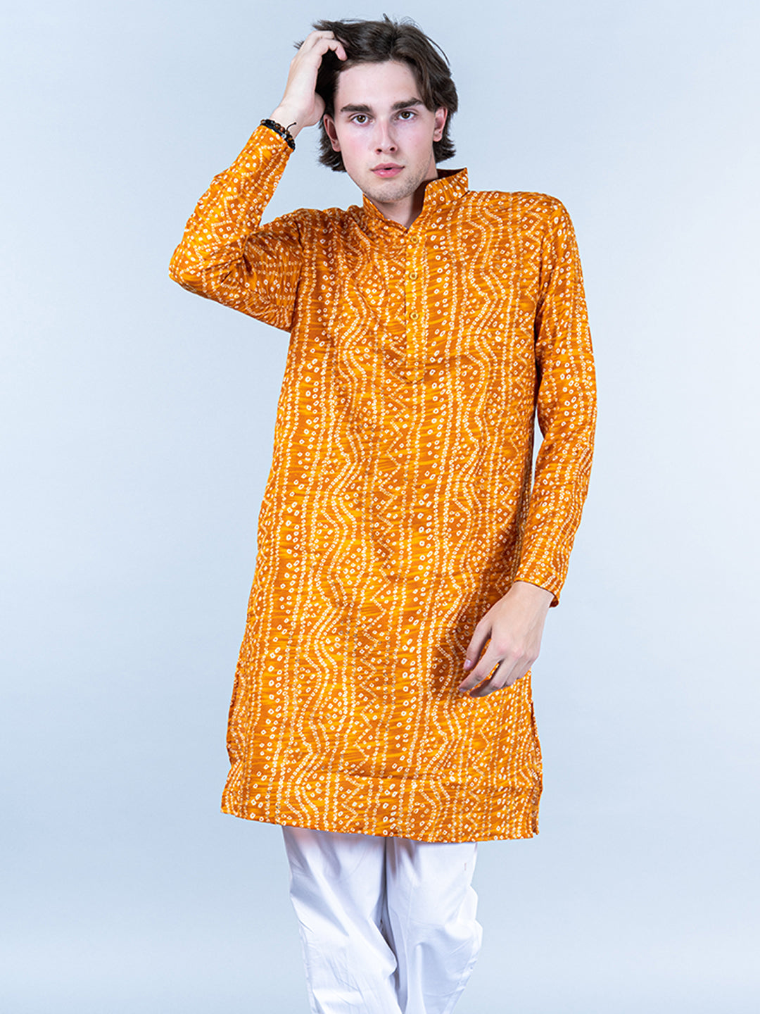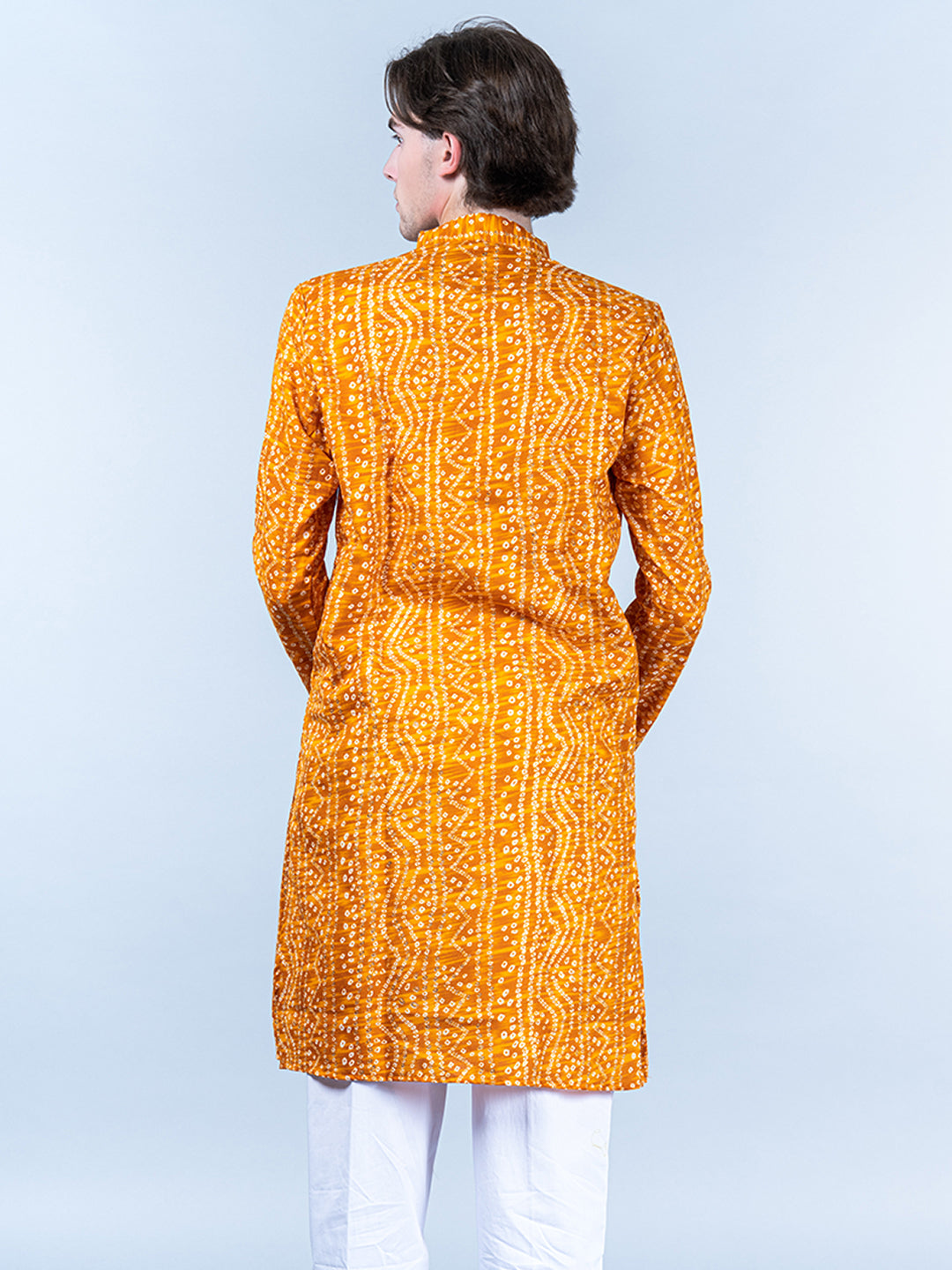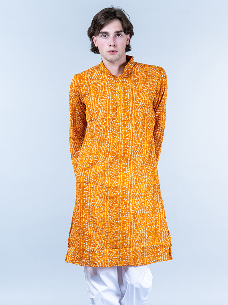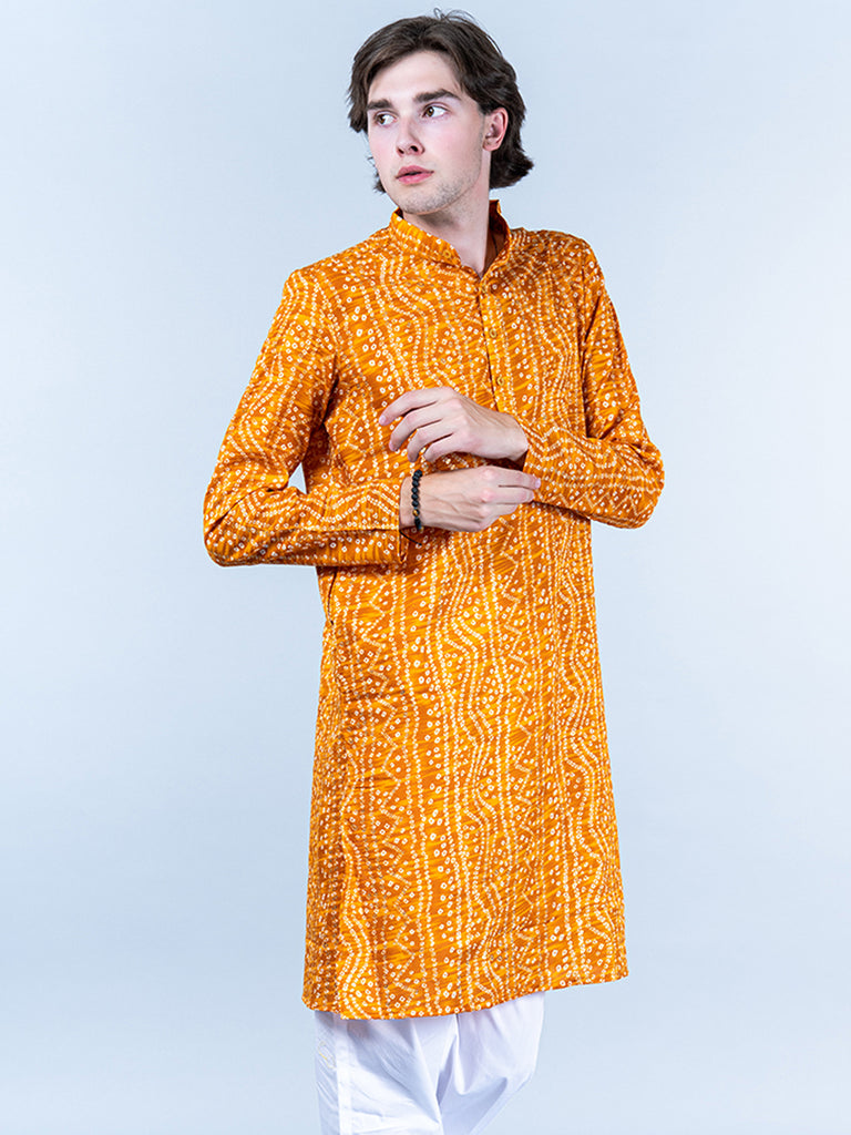 About the product- This Yellow Bandhani Printed Mens Cotton Kurta is lightweight and comfortable. This full-sleeve kurta is all set to take your style to the next level.