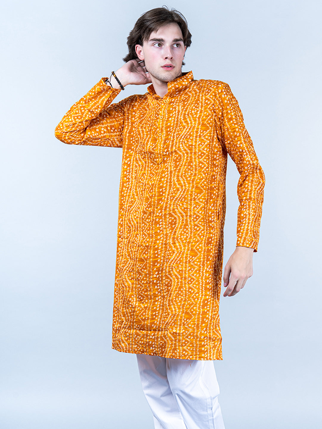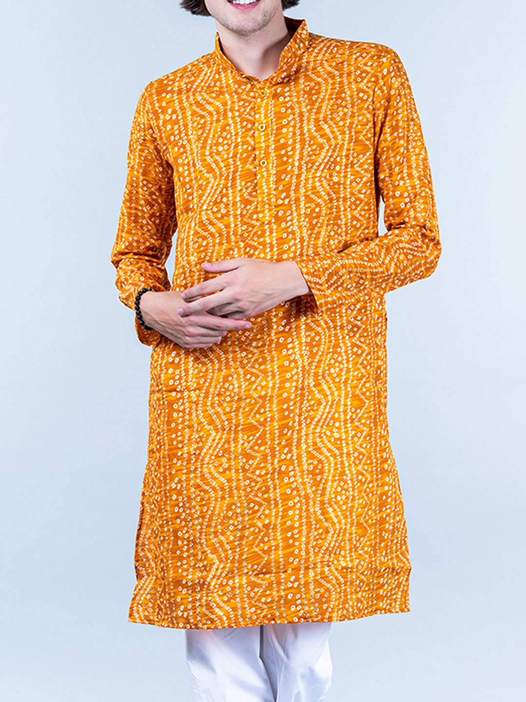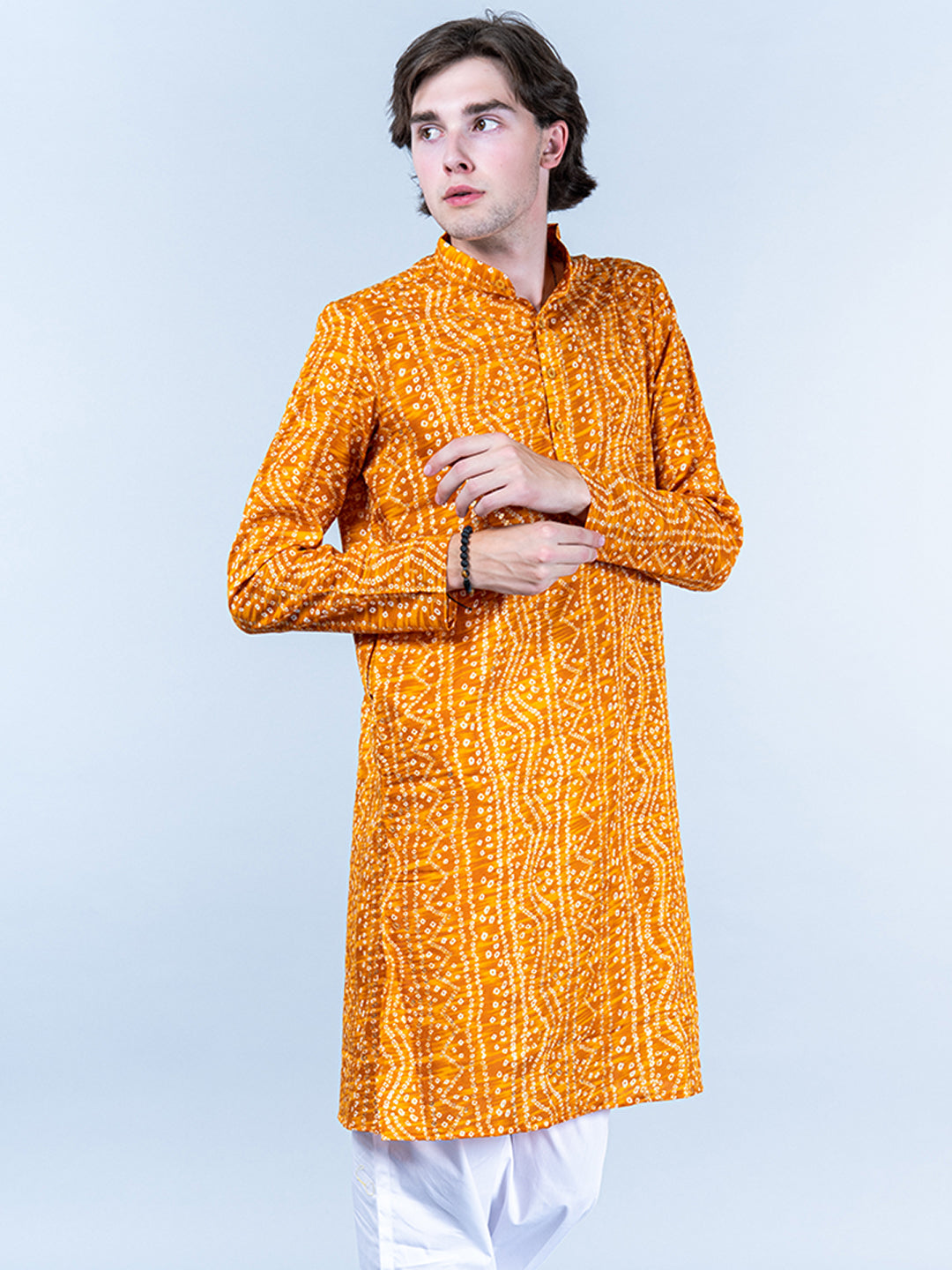 About the product- This Yellow Bandhani Printed Mens Cotton Kurta is lightweight and comfortable. This full-sleeve kurta is all set to take your style to the next level.