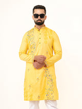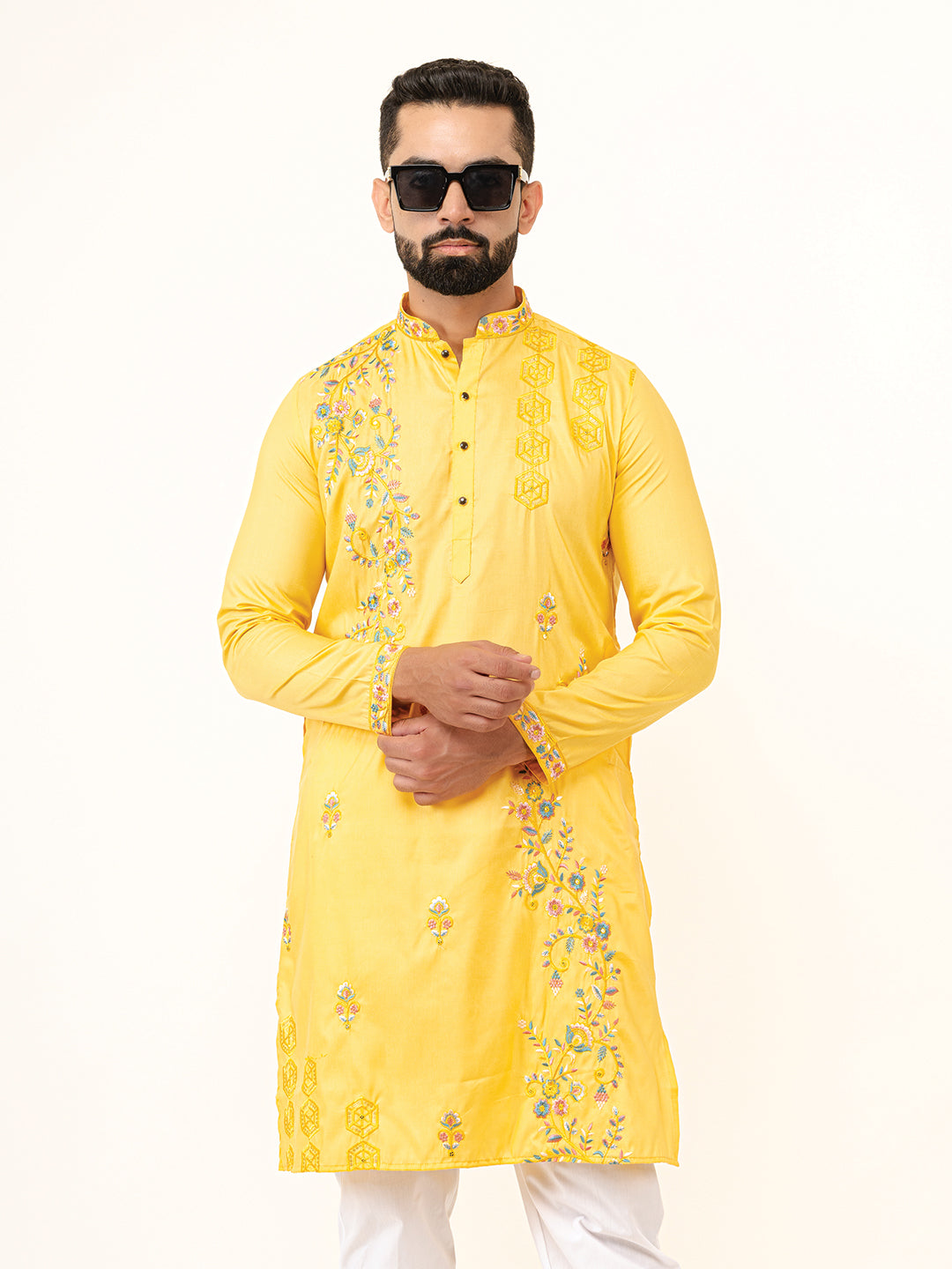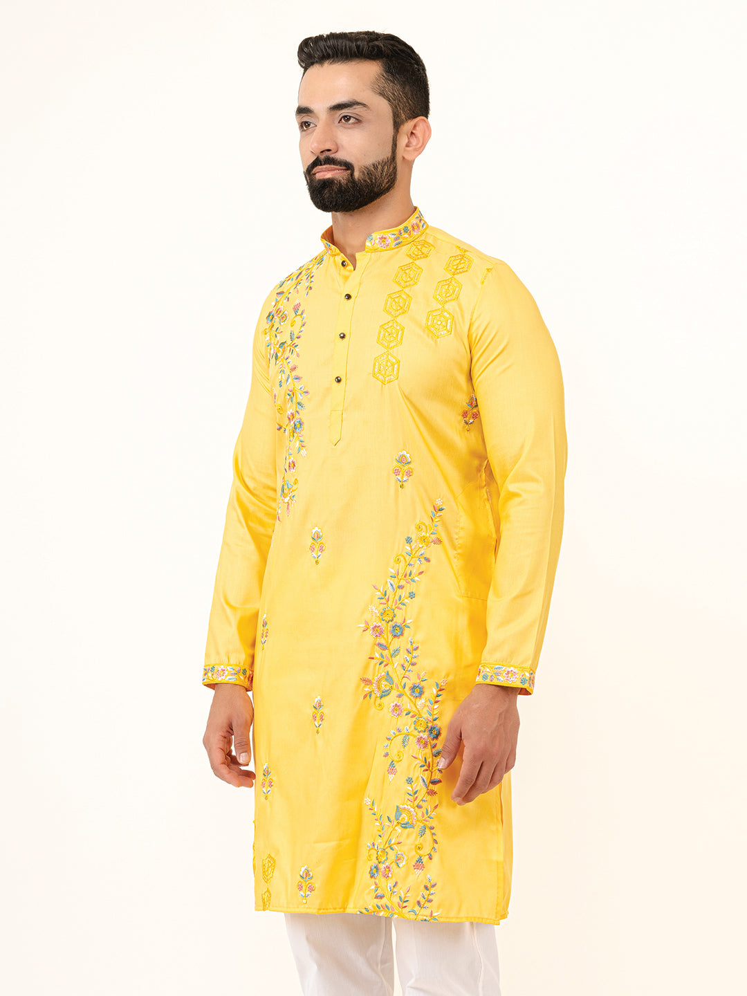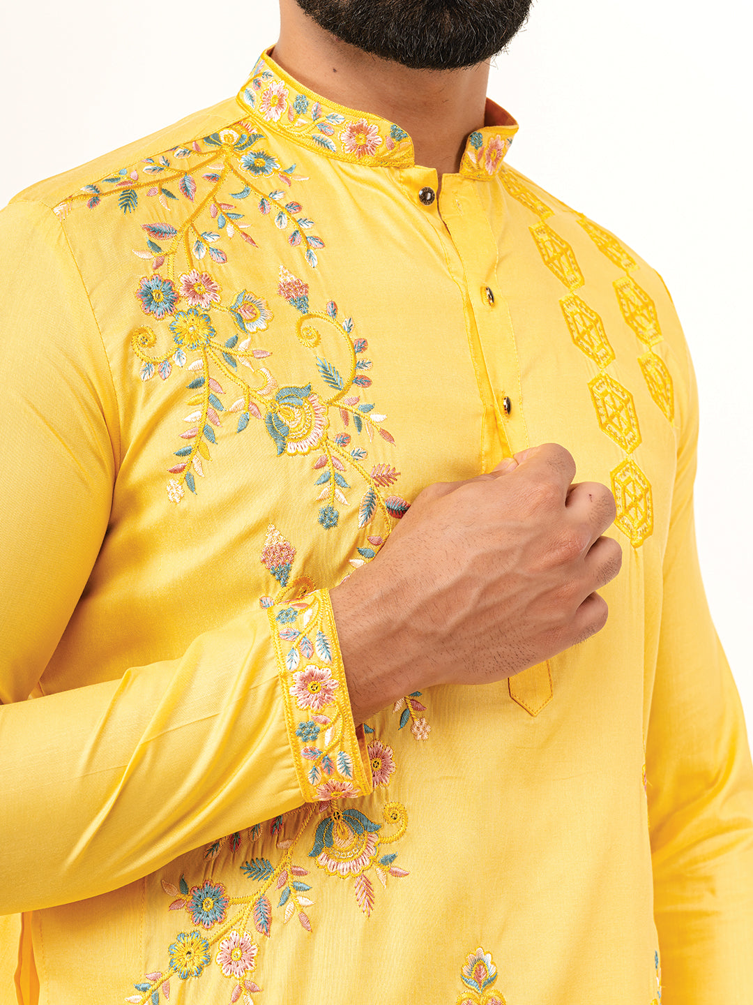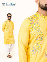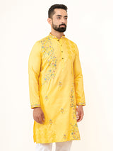 Step into elegance with this exquisite Yellow Embroidered Traditional Kurta. Crafted from rich silk, it features intricate floral and geometric embroidery patterns in contrasting hues, enhancing its regal charm. Perfect for festive and celebratory occasions, this kurta combines tradition with contemporary style.